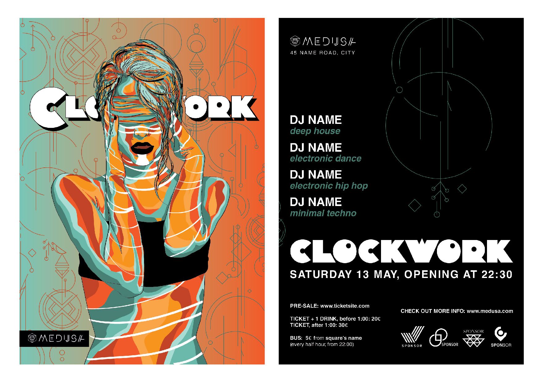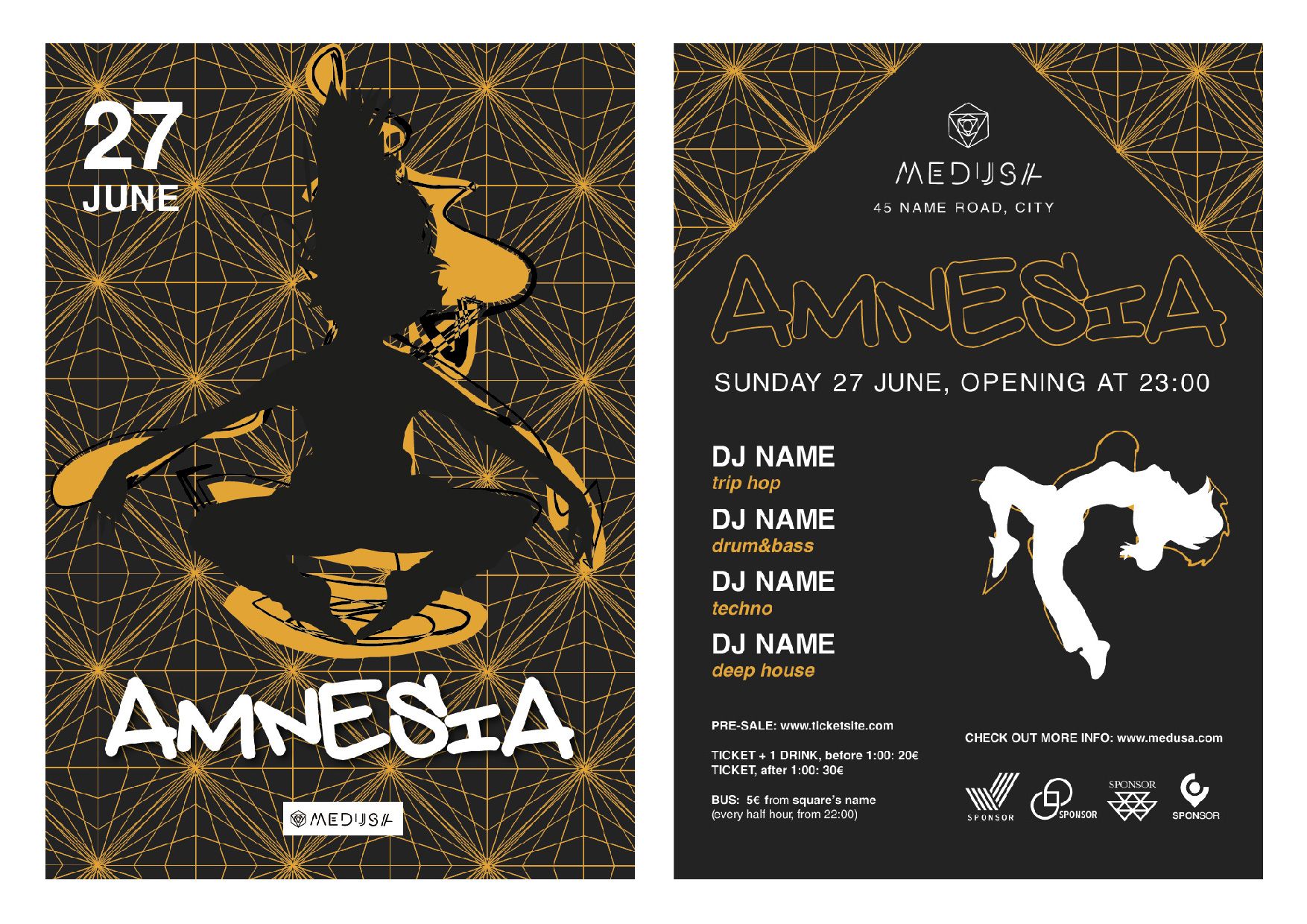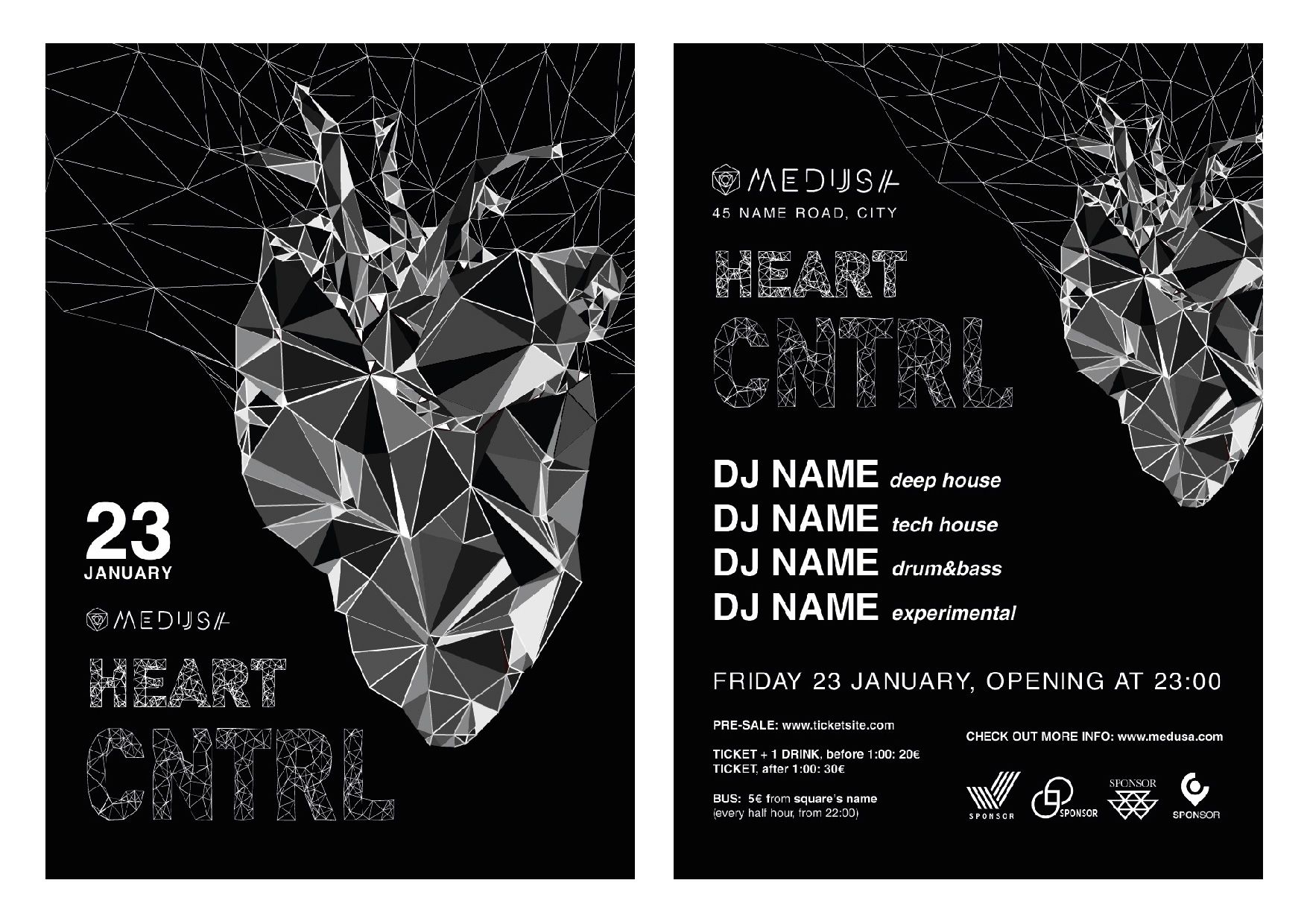 The Medusa is an extremely particular and alternative place, intended for a very specific target. It is therefore not in competition with the clientele of other establishments, but differs in the exclusivity of the experience it offers. However, this does not preclude it from the general clientele: some can go there for taste, and some for curiosity. Architecture in this sense plays a key point in its competitiveness on the market. It is not a place that tends to appear, but more to hide, similar to a speakeasy. Use customers, and not communication, to promote itsself (see Business Card). On an advertising level, he uses illustrations or photomontages in flyers, mock-ups and in his social being, where black plays a decisive role and where geometry is always present, to recall the environment of the venue itself. Its strengths are therefore the originality and uniqueness of the environment, music and communication.