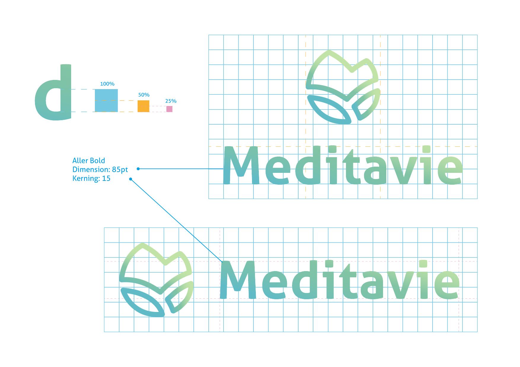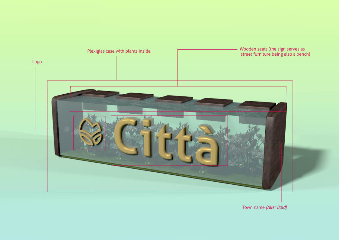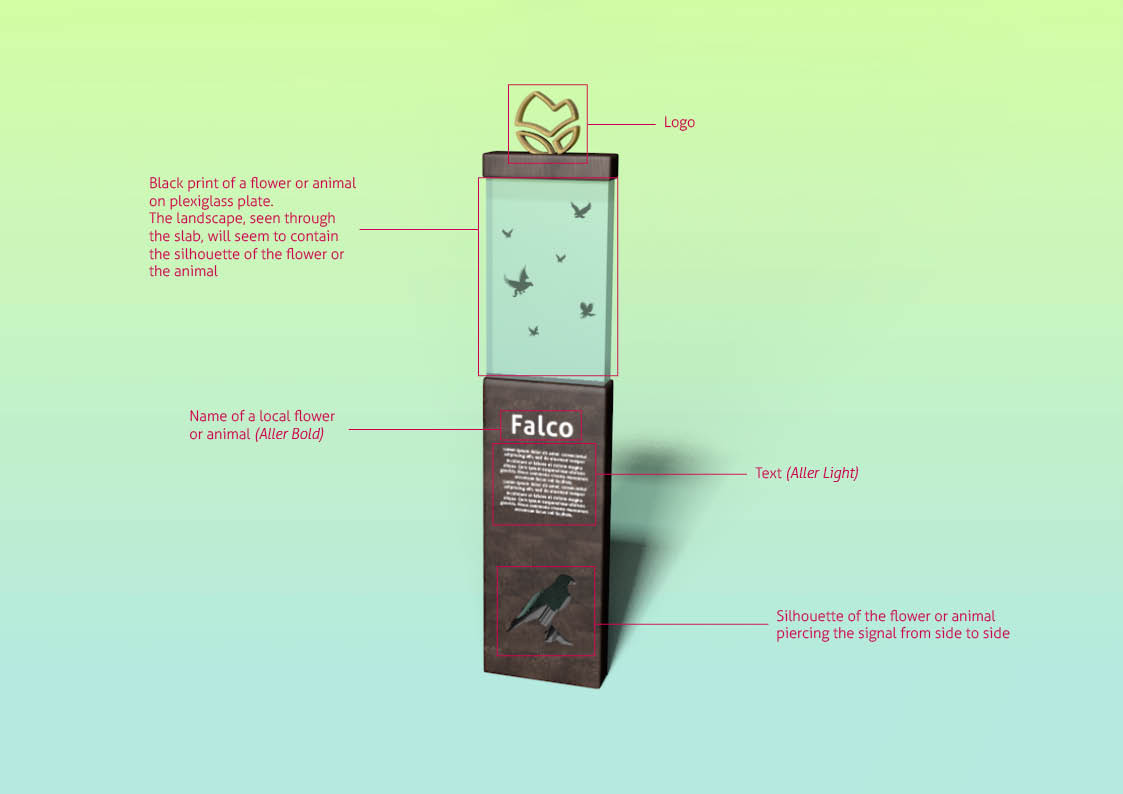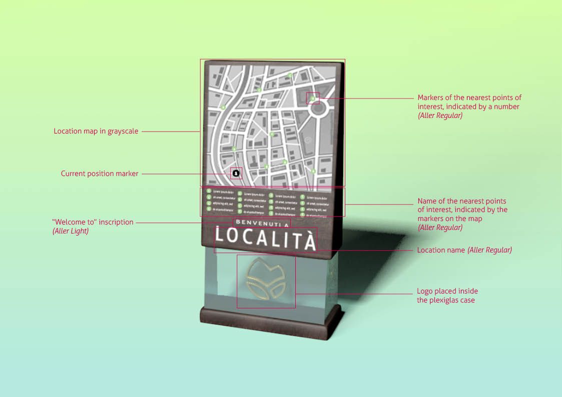 The font chosen for the logotype is Aller Bold, a sans serif font that, in its slender and soft shapes, recalls the pictogram. Its family, composed of seven different styles, can be extremely versatile, as it is easily readable both in small and large sizes. This characteristic can lead to its use in future titles, prints on gadgets or signage supports. Another important feature is that it is free-commercial use and therefore usable without copyright problems in case of use at sale.